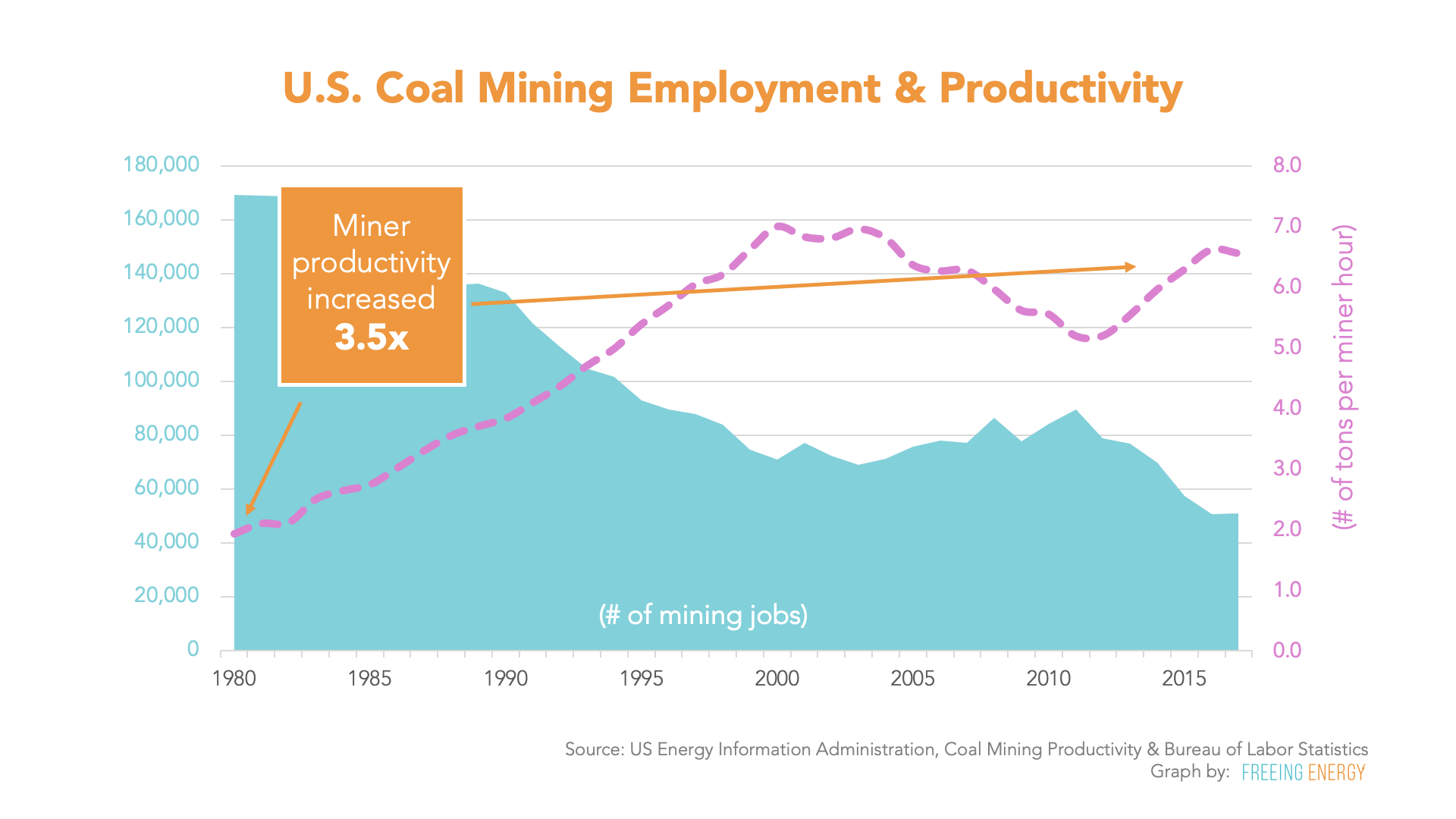 This particular wrecking ball of jobs isn’t the result of environmental regulations, the reduction in coal production, or even competition from cheaper natural gas. It certainly os not because of a political war targeting coal. This staggering loss of jobs is self-inflicted by the coal industry itself. From 1980 to 2017, US coal production dropped a mere 6% but 70% of mining jobs were lost.