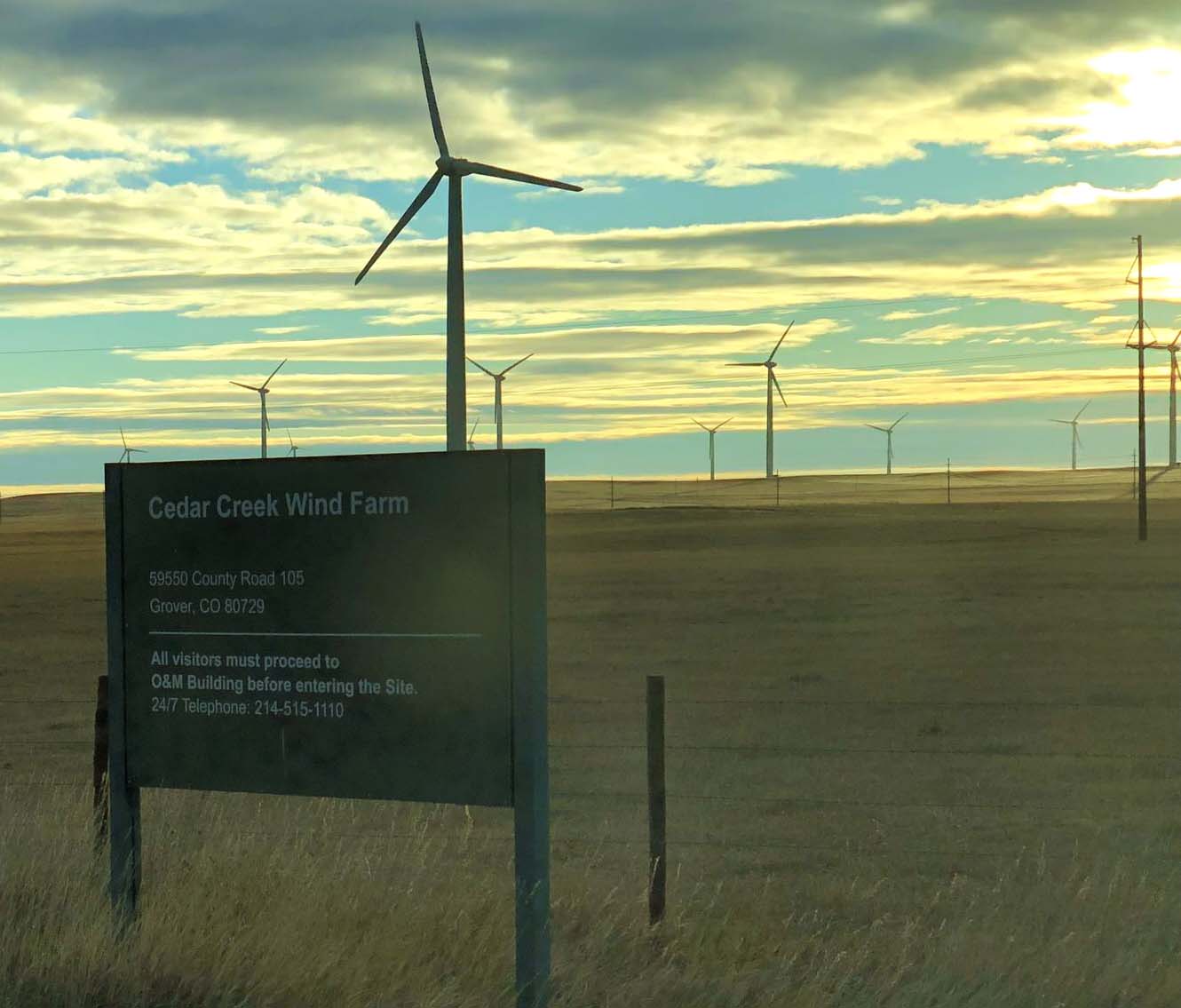 The Cedar Creek Wind Farm is located about two hours drive northeast of Denver, Colorado. Its 397 wind turbines produce 550 megawatts of electricity which travels along 80 miles of transmission lines to feed into the regional utility’s grid.
