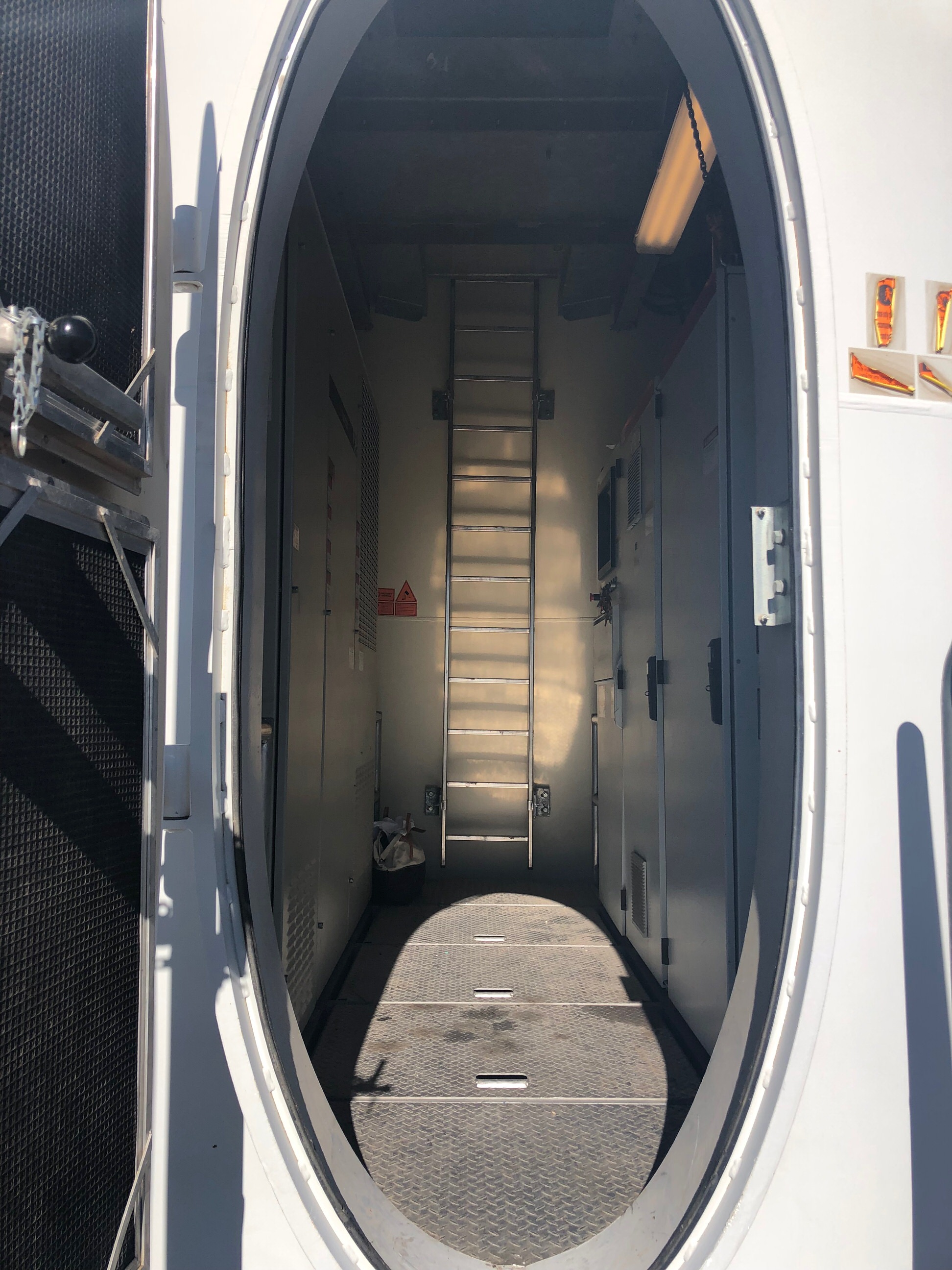 The wind was so strong, we quickly retreated inside the turbine tower to finish putting on our gear. Inside the tower’s base was a room, maybe 20 feet wide with a corrugated metal ceiling 8 feet over our heads. Electric panels on both sides made a narrow path from the door to a ladder at the far end. We shut the door, turned on the light, and wrapped our harness straps over our shoulders and between our legs and clicked everything in place. Bob stepped to the ladder and climbed up a few rungs, unlatched the hatch and disappeared. I followed and John came behind me.