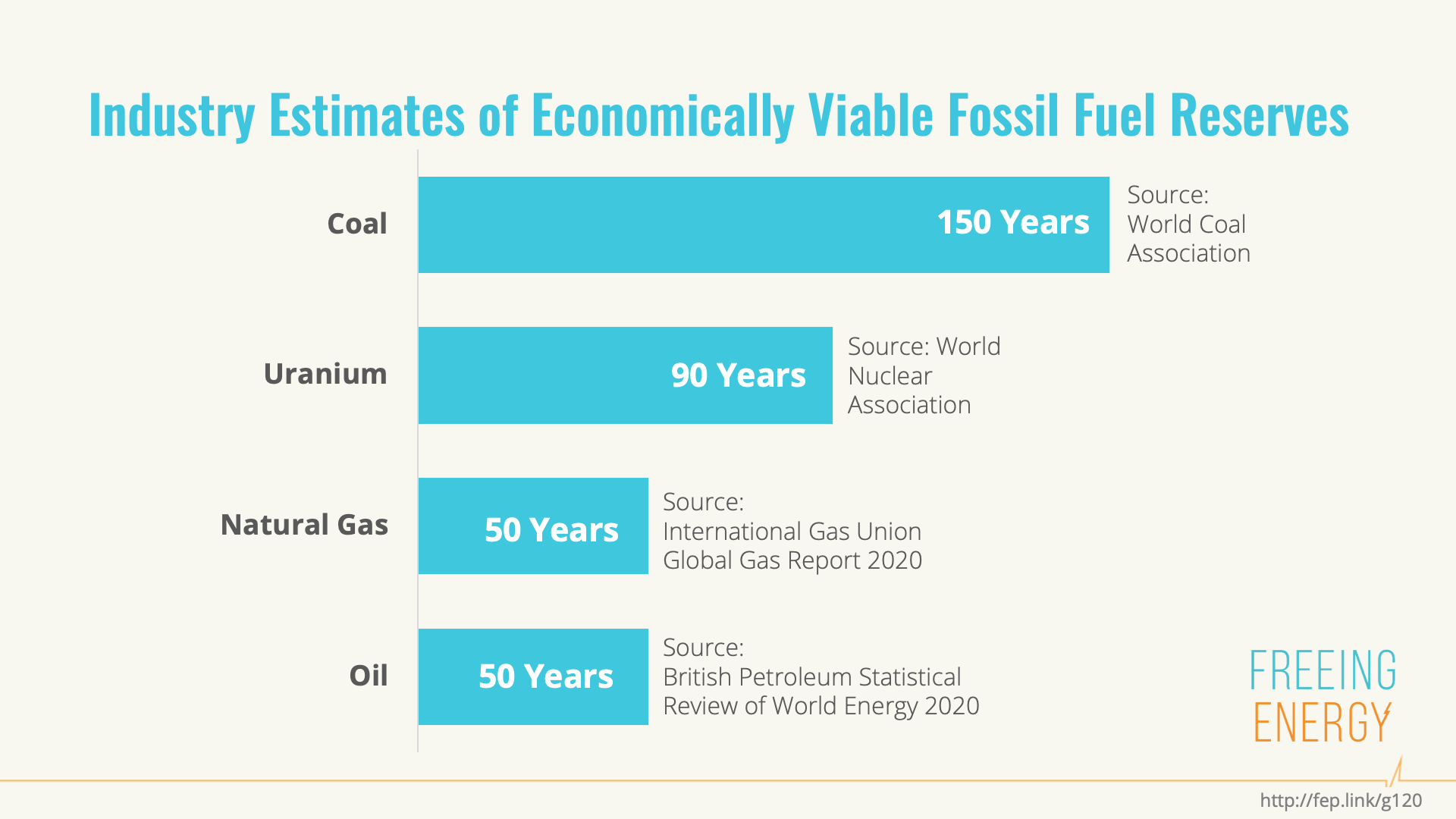 While not technically a fossil fuel, Uranium is also a finite form of fuel. Like coal and gas, it is buried in the ground in varying qualities and geographies. And like coal and gas, predictions for reserves are all over the map. A nuclear trade group, World Nuclear Association, puts reserves at 90 years.